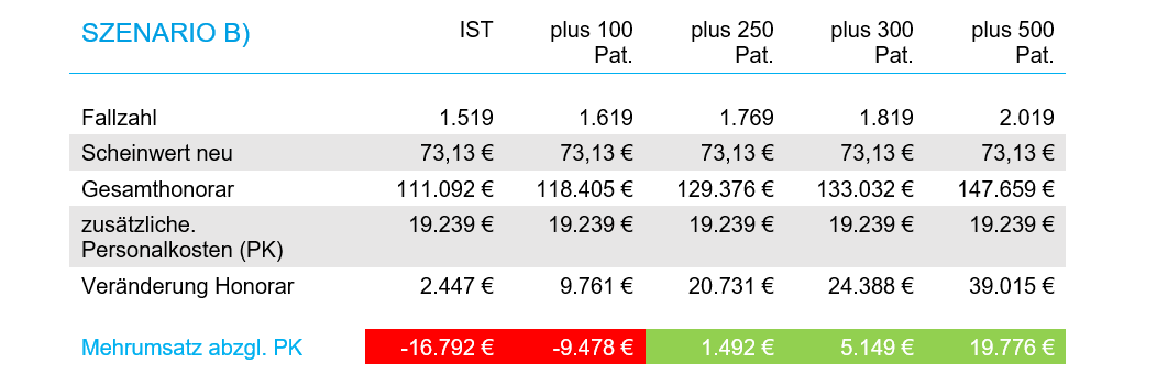 Eine ähnliche Rechnung kann erstellt werden, wenn der anzustellende Arzt zusätzliche Leistungen einbringt, die bisher in der Praxis nicht durchgeführt wurden oder wenn vorhandene Abrechnungs-Potentiale ausgeschöpft werden können. Daraus resultieren ein höherer Scheinwert und wiederum ein höheres Honorar sowie letztendlich eine geringere Zahl zusätzlich zu behandelnder Patientinnen.