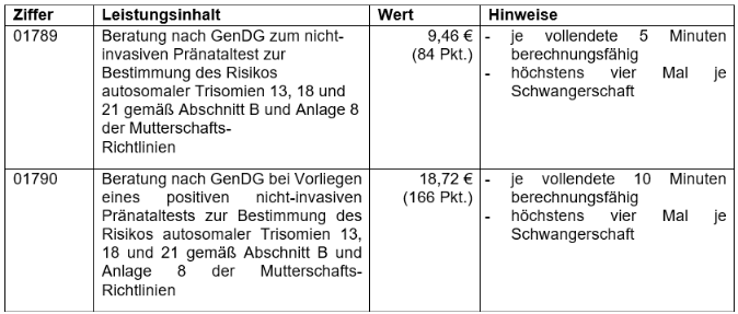 Die Laborleistung selbst, d.h. die Untersuchung der fetalen DNA, darf nur von Fachärzten für Humangenetik oder Laborärzten durchgeführt und abgerechnet werden. Hierfür steht die Ziffer 01870 ab 01.07.2022 zur Verfügung und ist mit 184,99 € bewertet.