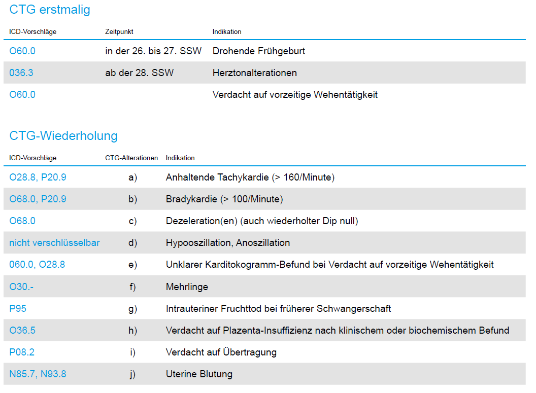 Wird aufgrund einer der vorgenannten Indikationen ein CTG durchgeführt, ist dies mit einer entsprechenden Diagnosekodierung in der Patientenakte bzw. in der Abrechnungsdatei zu dokumentieren. Dies ist insbesondere vor dem Hintergrund wichtig, dass eine nicht kodierte Diagnose bei einer Abrechnung des CTG als Kassenleistung zu Prüfungen bzw. Honorarkürzungen führen kann.