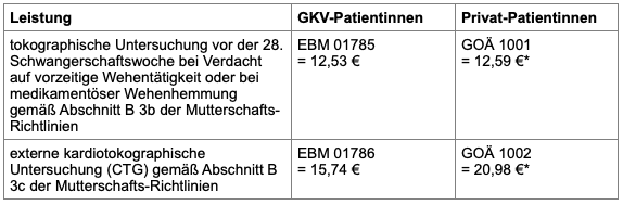 Abrechnung tokographische Untersuchung und externe kardiotokographische Untersuchung (CTG)